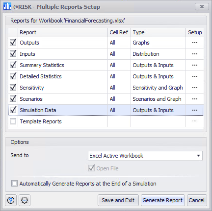Save and Exit - Validates and saves the report settings in the dialog without actually creating a report.