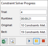 Additionally, if an Evolver model contains multiple hard constraints, and the optimization process fails with all solutions invalid, Evolver will prompt the user to run the Constraint Solver. This runs an optimization in a special mode, in which the goal is to find a solution that satisfies all the hard constraints. The optimization progress is shown in the same way as in regular optimizations - through the Progress Window (Figure 2, below) or through the expanded Evolver Watcher (Figure 1, right) window.