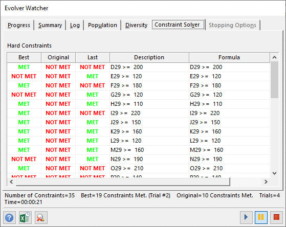 A Constraint Solver optimization stops automatically when a solution meeting all the hard constraints is found; it can also be stopped manually by clicking the Stop button in the progress window or in the Evolver Watcher (see below). After a Constraint Solver run completes, The Stopping Options tab will open with options to keep the Best, Original, or Last solution identical to normal optimizations.