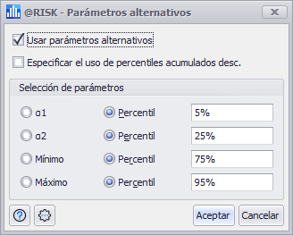 Muchas funciones de distribución pueden utilizar un conjunto alternativo de parámetros; por ejemplo, una función de probabilidad Normal utiliza una media y una desviación estándar como parámetros estándar, pero puede utilizar valores de percentiles para los umbrales izquierdo y derecho en su lugar. En general, los parámetros alternativos permiten utilizar los percentiles como parámetros de la distribución en lugar de los argumentos estándar.