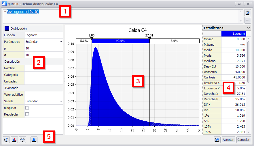 Uno de los primeros pasos del análisis de riesgos es construir un modelo; el modelo incluirá una o más entradas, que pueden ser simples valores para cantidades conocidas, o distribuciones de probabilidad que representan valores con algún grado de incertidumbre. La ventana Definir distribución introducirá una fórmula en la celda seleccionada utilizando la función de @RISK que corresponde a la distribución seleccionada.
