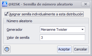 Marque la casilla 'Asignar semilla individualmente esta distribución' para activar la semilla de la distribución; en la sección Número aleatorio de la ventana, seleccione el generador de números aleatorios que se va a utilizar y establezca el valor de semilla según sea necesario. Vea Generación de números aleatorios para más información.