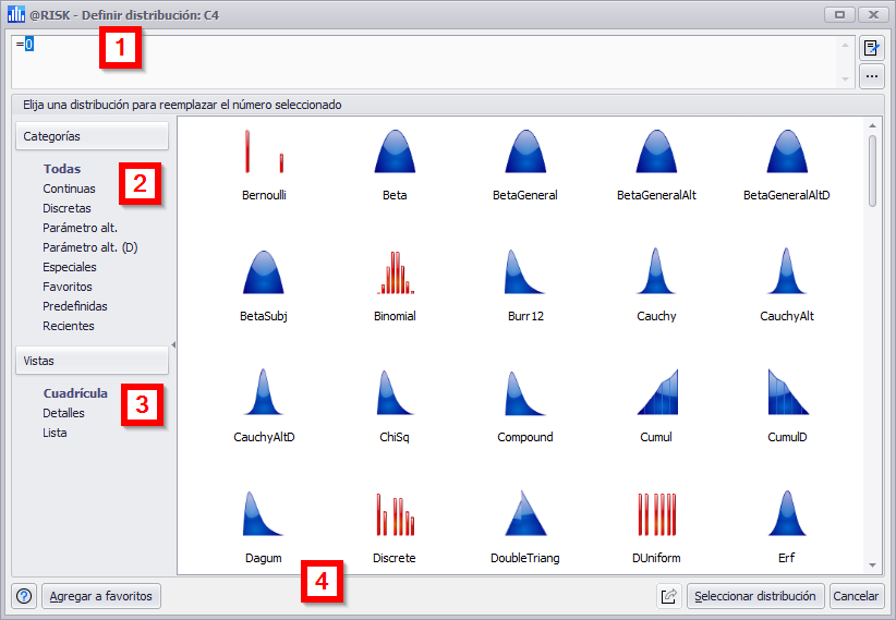 Agregar un nueva distribución: Si la celda seleccionada no tiene función de distribución, la ventana comenzará con una pantalla de selección de distribución (Figura 2, abajo). Seleccione la distribución deseada en el panel principal y haga clic en el botón Seleccionar distribución.