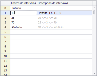 De forma similar a los grupos de igual tamaño, el primero y el último intervalo pueden configurarse para que se extiendan hasta menos y más infinito cuando se trabaja con un conjunto de datos con límites desconocidos. Por ejemplo, la figura 2 ilustra una configuración de intervalos en la que el primer intervalo se extiende desde "menos infinito hasta menos de 10", y el último intervalo se extiende desde "mayor o igual a 70 hasta más infinito".