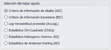 El proceso de ajuste genera estadísticas de bondad de ajuste para cada distribución probada, utilizando varios métodos diferentes para clasificar lo bien que se ajusta una distribución (y sus parámetros estimados) al conjunto de datos seleccionado. La configuración de la Selección del mejor ajuste (Figura 1, derecha) determina qué método de clasificación se mostrará inicialmente en los resultados del ajuste, pero las estadísticas de todos los métodos se generan durante el proceso de ajuste.