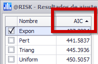 La clasificación utilizada por @RISK para recomendar la distribución de mejor ajuste se selecciona inicialmente en la pestaña Resultados de la ventana Ajustar distribuciones a datos; sin embargo, el método de clasificación puede cambiarse después de la ejecución del proceso de ajuste. El método de clasificación actualmente activo en la ventana Resultados del ajuste se mostrará en la cabecera de la columna de la lista de distribuciones (Figura 2, derecha).