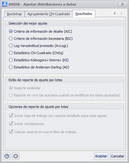 La sección Selección de mejor ajuste permite seleccionar la metodología utilizada por @RISK a la hora de clasificar cada distribución en términos de mejor ajuste; véase Métodos de clasificación de ajuste para más información.