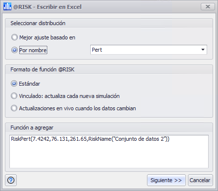 La última sección de la ventana muestra la función exacta de @RISK que se insertará en el modelo, incluyendo los parámetros que se utilizarán. La modificación de cualquier configuración en las secciones anteriores actualizará la función mostrada.