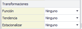 Los campos de 'Transformaciones' (Figura 2, derecha) se utilizan para aplicar la transformación a los valores de los datos generados para un modelo de series de tiempo. Véase Transformaciones de series de tiempo para una discusión completa sobre el uso de las transformaciones.