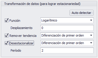Para el ajuste de una sola serie de tiempo, haga clic en el botón 'Auto detectar' para aplicar las transformaciones recomendadas; éstas siempre pueden modificarse antes de ejecutar el ajuste.