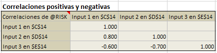 Si la celda o celdas seleccionadas forman parte de una correlación existente - ya sea las distribuciones de entrada incluidas o una celda dentro de los datos de la matriz de correlación (Figura 4, abajo) - se abrirá la ventana 'Definir correlaciones' con la configuración de la matriz de correlación existente.