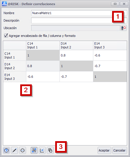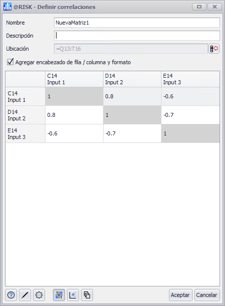 Si la celda o celdas seleccionadas contienen distribuciones de entrada, pero no forman parte de las correlaciones existentes, se abrirá la ventana Definir correlaciones y se iniciará una nueva matriz de correlación. La nueva matriz no incluirá ningún coeficiente.