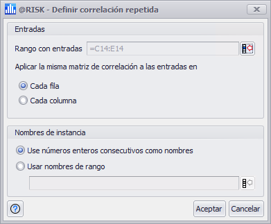 Cuando múltiples conjuntos de entradas relacionadas deben correlacionarse utilizando la misma matriz de correlación (por ejemplo, un conjunto de entradas múltiples que se crean para abarcar varios años), el comando Definir correlación repetida puede utilizarse para crear una única matriz de correlación y aplicarla a múltiples instancias al mismo tiempo.