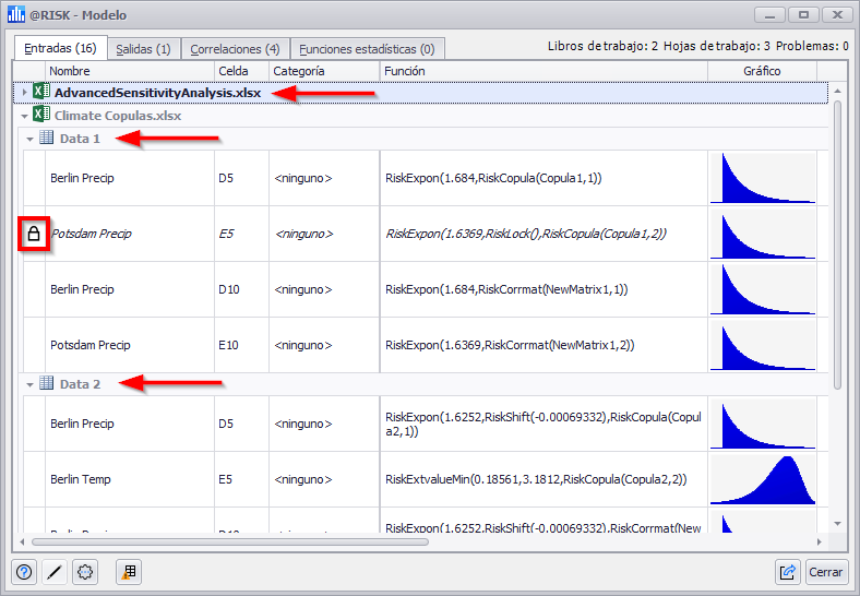 Tenga en cuenta: que cuando hay varios libros de trabajo de @RISK abiertos, la ventana Modelo muestra los elementos de @RISK de cada libro de trabajo abierto y de cualquier hoja de trabajo que incluya un elemento de @RISK. Por defecto, los elementos de un archivo determinado aparecerán bajo un encabezado plegable que incluye el nombre del libro de Excel donde se encuentra ese elemento, así como un encabezado plegable separada con el nombre de la hoja de trabajo.