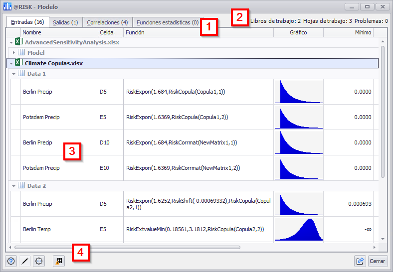 Los elementos de @RISK incluidos en un modelo se clasifican en cuatro pestañas para su visualización en la ventana 'Modelo'. La pestaña muestra tanto el nombre de la categoría - 'Entradas', 'Salidas', 'Correlaciones' y 'Funciones estadísticas' - como el número de elementos (Figura 2, derecha) incluidos en esa pestaña. Las pestañas de categoría y su contenido son: