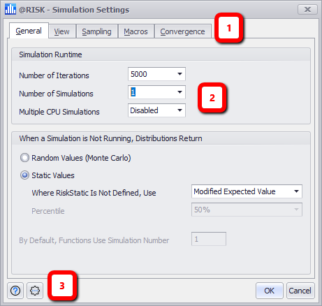 At the very minimum, a simulation run needs to have the number of iterations and simulations set before it can be executed; @RISK has default settings, but these may not be appropriate for any given model. To set the basic configurations for a simulation: