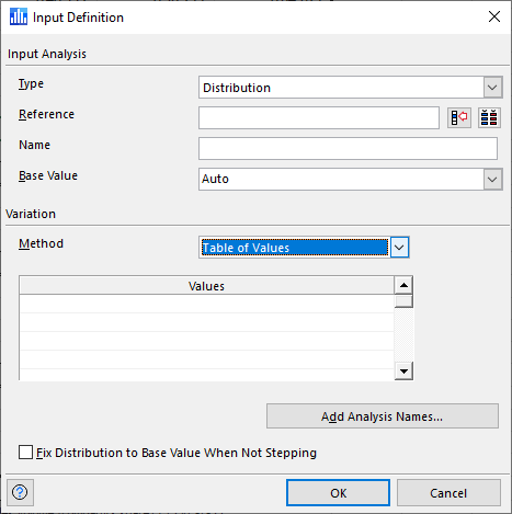 Analysis names relate to the variation method being used on the input. By default, the analysis name uses the variation method and degree of variation as the name, e.g. "Percentile %: 1%" for Distribution Percentile or "Base - 10.00%" for Percent Change from Base.