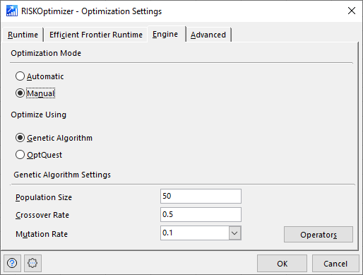The Engine tab (Figure 3, right) contains settings that control the optimization algorithms used by RISKOptimizer.