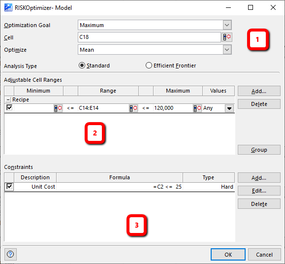 The Model Definition window (Figure 1, below) provides an interface for defining a RISKOptimizer model, including its objectives, adjustable cells, and constraints.