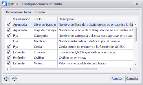 Tenga en cuenta, que los campos que aparecen en Configuraciones de tabla cambiarán en función de los modelos de @RISK que estén abiertos en ese momento. Por ejemplo, si sólo hay un modelo de @RISK abierto y ese modelo sólo tiene elementos de @RISK en una hoja de trabajo, los campos Libro de trabajo y Hoja de trabajo no se mostrarán.