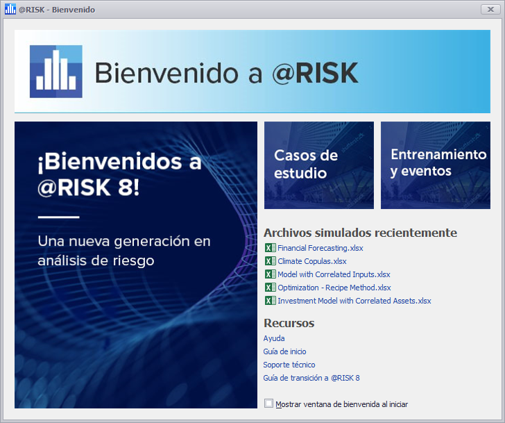 A menos que esté desactivada, la ventana de Bienvenido se abrirá cada vez que se inicie @RISK.