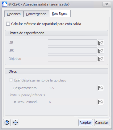 Las configuraciones de 'Seis Sigma' están desactivadas por defecto, y no pueden establecerse para toda la simulación - deben establecerse para cada salida individualmente. Si la salida seleccionada debe utilizar la metodología 'Seis Sigma', esas configuraciones se configuran en la pestaña Seis Sigma de la ventana Agregar salida (avanzado) (Figura 1, derecha).