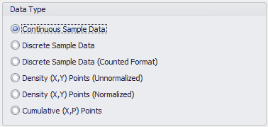 In order for the fitting process to be most effective, the type of data set being analyzed needs to be designated; this is done in the Data Type section of the Data tab (Figure 1, right). Additionally, the list of distributions available will change based on the Data Type that is selected. See Selecting Distributions for Fit for more information about choosing distributions during the fitting process.