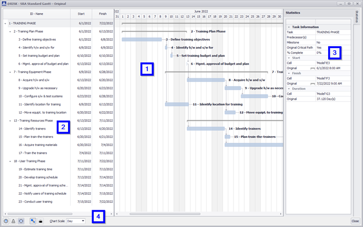 The Gantt chart includes several components designed to help to visualize and analyze the schedule.