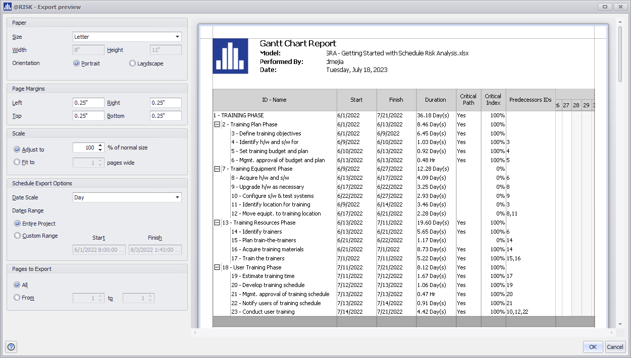 This new feature to export to PDF and print SRA Gantt Charts enables customization of Standard and Probabilistic Gantt Chart exports, including project dates, scales, and industry standards like paper sizes, page margins, orientation, and scale.