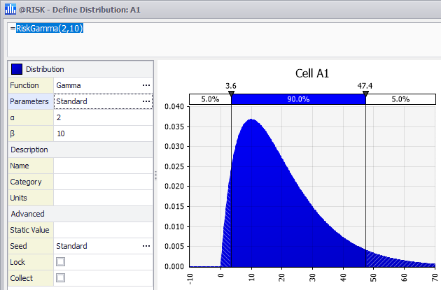 When specifying truncation and shift together, careful consideration needs to be given to whether the truncation occurs before or after the shift. For example, consider a RiskGamma(2,10) distribution with a minimum truncation of 5 and a shift of 3, but with the truncation applied two different ways (Figure 3, 4 and 5, right). Figure 3 demonstrates the distribution function without truncation or shift.
