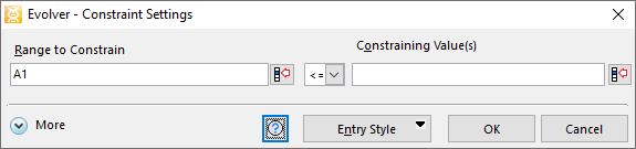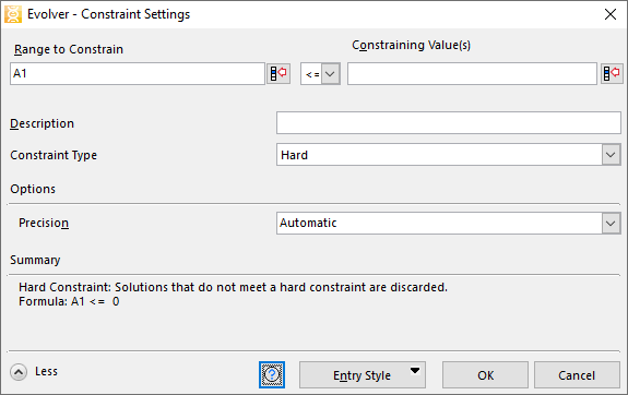 To select the type of constraint, use the Entry Style button at the bottom of the Constraint Settings window (Figure 2, above). See Constraint Entry Style for more information.