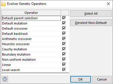 Genetic algorithms use genetic operators to create new members of the population from current members. Evolver includes selectable genetic operators that can be used when generating possible values for the adjustable cells. These options can be set manually, or Evolver can automatically test all available operators and identify the one that performs best for a model.