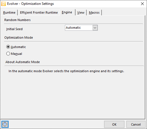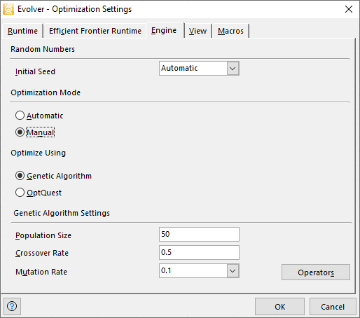 The Engine tab selects the optimization engine and settings that will be used during an analysis. Evolver has two optimization engines to search for optimum solutions to a problem - OptQuest and Genetic Algorithm.