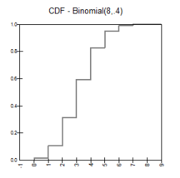 RiskBinomial(n, p) specifies a binomial distribution with parameters n and p. This is usually used to model the number of “successes” in n independent, identical trials, where p is the probability of success on each trial. For example, RiskBinomial(10,20%) represents the number of discoveries of oil from a portfolio of 10 prospects, where each prospect has a 20% chance of having oil. An important modelling application is when n=1, so that there are two possible outcomes (0 or 1), where the 1 has probability p, and the 0 has probability 1-p. (In this case, it is equivalent to the RiskBernoulli function with parameter p.) With p=0.5, it is equivalent to tossing a fair coin. For other values of p, the distribution can be used to model event risk, that is, the occurrence or nonoccurrence event, or to transform registers of risks into simulation models to aggregate the risks.
