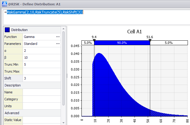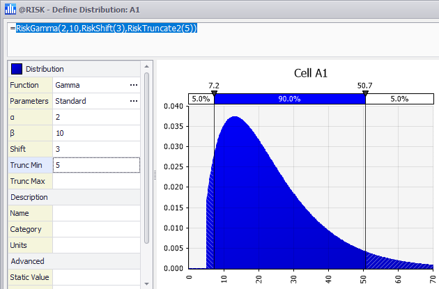 When specifying truncation and shift together, careful consideration needs to be given to whether the truncation occurs before or after the shift. For example, consider a RiskGamma(2,10) distribution with a minimum truncation of 5 and a shift of 3, but with the truncation applied two different ways (Figure 3, 4 and 5, right). Figure 3 demonstrates the distribution function without truncation or shift.